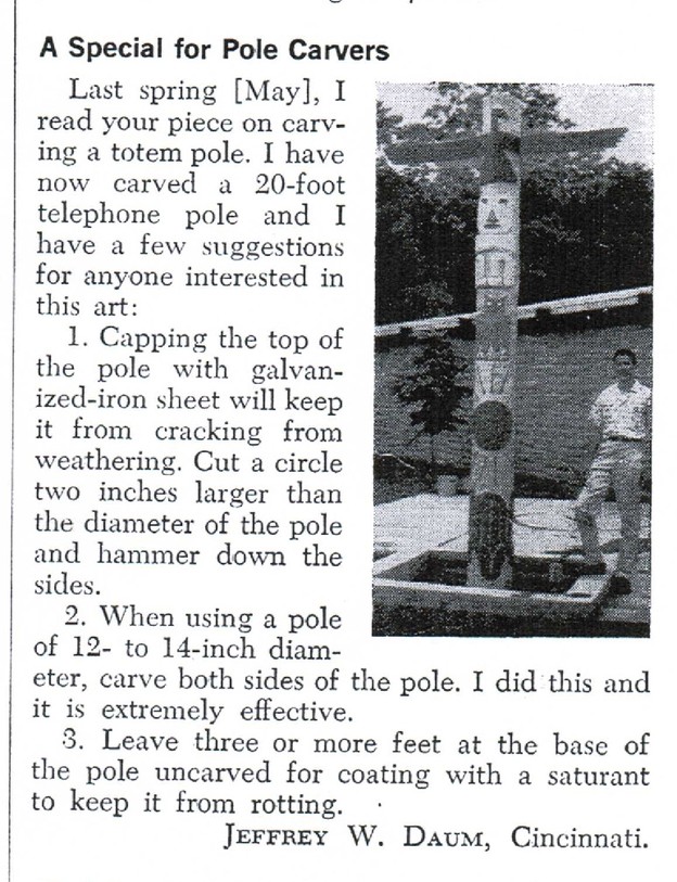Jeff Daum -- Love your photos, too, but really love your totem poles. When I was in high school and a Boy Scout in Clifton (Troop 3), one of our leaders got the idea that we'd love to carve some totem poles. My Dad, who worked for the Cincinnati Gas & Electric Co., told the guy who he could call to get some free electric line poles. The leader apparently never told the guy at the Gas Company what they were to be used for, because when three of them were delivered to the church where we met, they were covered with sticky and smelly creosote!